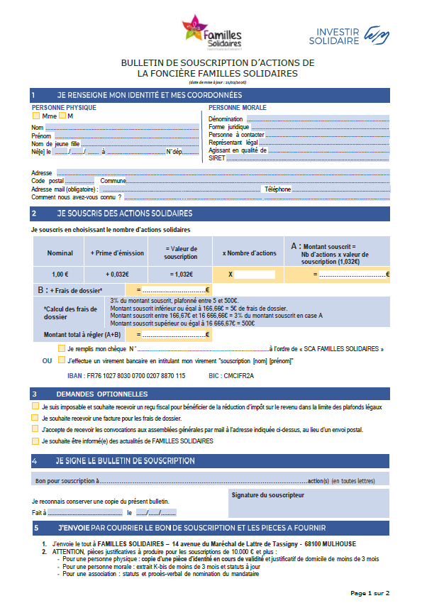 Etape 5Envoyer par courrier postal les bon de souscription et chèque tous deux remplis et signés, à Familles SolidairesFAMILLES SOLIDAIRES, 14 Av. du Maréchal de Lattre de Tassigny 68100 MULHOUSE -